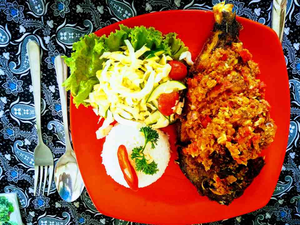 – Các món ăn truyền thống không đa dạng như ở Việt Nam nhưng cũng có nhiều lựa chọn. Các món địa phương phổ biến nhất là cơm chiên (Nasi Goreng), mì xào (Mie Goreng) và miến gà (Soto Ayam). Ngoài ra còn có Cơm trộn các loại rau, thịt (Nasi Campur). Gà rất phổ biến, hiếm thấy bò, thỉnh thoảng thấy thịt heo trong thực đơn. Người ăn chay có thể gọi rau xào thập cẩm (Cap Cay). Tempeh (giống như đậu nành ép nguyên hạt, ăn rất chán); là món quốc hồn quốc túy của Indo, món gì cũng thấy bỏ vô nên nếu không thích ăn thì phải dặn họ trước. Vài chỗ làm ngon sẽ chiên giòn và đổ xốt chua ngọt hoặc rắc muối lên thì ăn rất được.