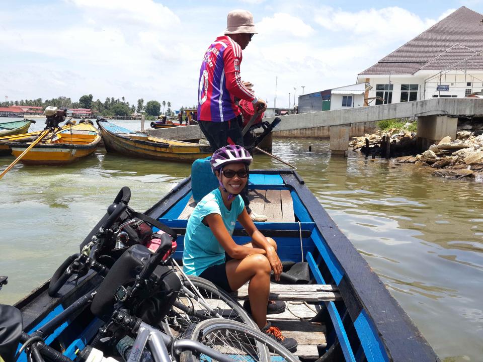 Ranh giới giữa 2 nước ở đây là con sông Golok nên qua biên giới phải đi bằng thuyền. Tụi mình thuê của 1 anh loanh quanh gần đó. Chở cả 2 chiếc xe đạp, đồ đạc và người tốn hết 100 THB (khoảng 60 ngàn VND). Chèo qua chừng 10 phút.