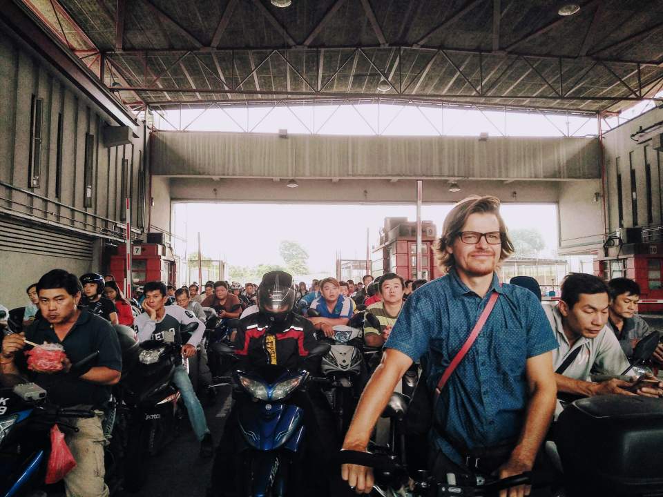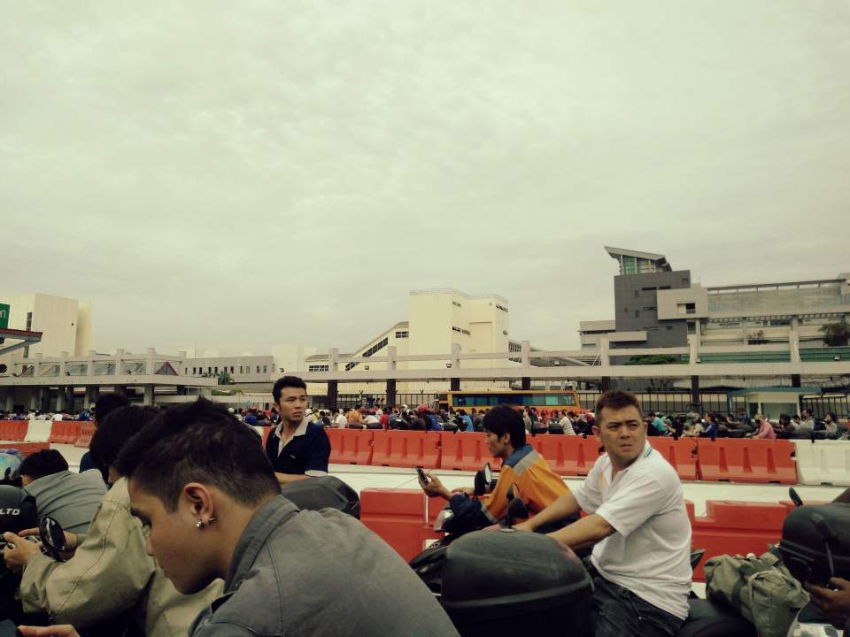 Nhìn dòng người như trẩy hội xếp rồng rắn hết cả đường làm tụi mình ngán ngẩm. May có 1 anh tốt bụng đứng kế bên nói với mình là xe đạp thì không phải xếp hàng. Xe máy xếp hàng để cà thẻ thôi. Thế là 2 đứa mừng quá lách qua lề đường bên hông, hỏi luôn anh cảnh sát gần đó. Ảnh thấy tụi mình thì dọn mấy cái chắn đường qua một bên cho tụi mình đi. Còn nói cứ chạy lên lề hoặc men theo đường xe hơi mà chạy. Thế là 2 đứa một mạch phóng cho nhanh để kịp về khách sạn trước khi trời tối.