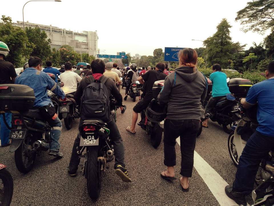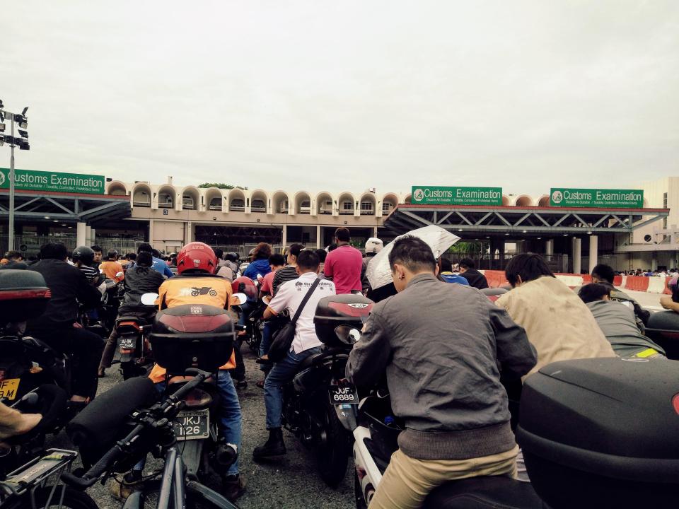 Khi tụi mình từ Singapore quay lại Malaysia vào khoảng 5 giờ chiều thì khi đến gần cửa khẩu, tụi mình lại tưởng đang nhìn lầm. Cách cửa khẩu còn gần mấy cây số mà xe máy đã xếp hàng chờ đông như kiến cỏ. Thì ra những người buổi sáng qua Singapore làm việc, buổi chiều họ cũng về lại nhà giờ này. Giờ cao điểm ở cửa khẩu là từ 5 giờ. Đến khoảng 10 giờ tối người mới giãn bớt.