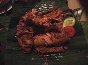 Con gà nhỏ chừng hơn nửa ký, được nhồi gia vị, cà chua, hương thảo. Vị đậm đà, thơm ngon. Có thể gọi mua nửa con, 45 ngàn IDR/phần.