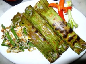 Phần cơm gà nướng, lá mì nước cốt dừa, cơm vàng: 25k IDR
